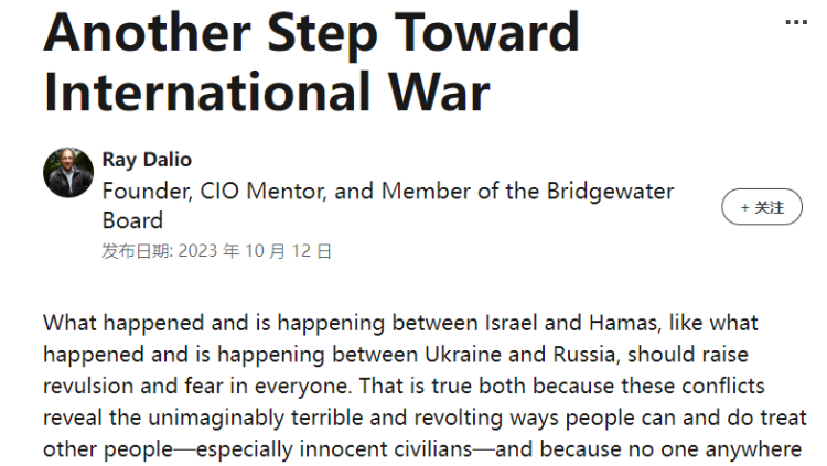 3、桥水基金达利欧:巴以冲突升级为世界大战的可能性已经达到50%