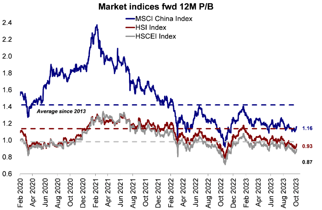 图表:恒生指数和恒生国企指数12个月动态市盈率仍然低于1倍