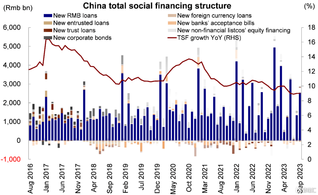 2) 金融:9月新增社融大幅超出市场预期。9月M2同比增长10.3%,较上月下降0.3ppt。9月新增社融4.1万亿元,超出市场预期的3.7万亿元,同比多增5789亿元。分部门来看,政府部门融资扩张,居民部门融资回暖,企业部门融资高位持平。9月新增人民币贷款2.3万亿元,低于市场预期的2.5万亿元,并少于去年同期。整体来看,金融数据内生恢复存在不确定性,不过经济短期企稳的概率在增加[3]。