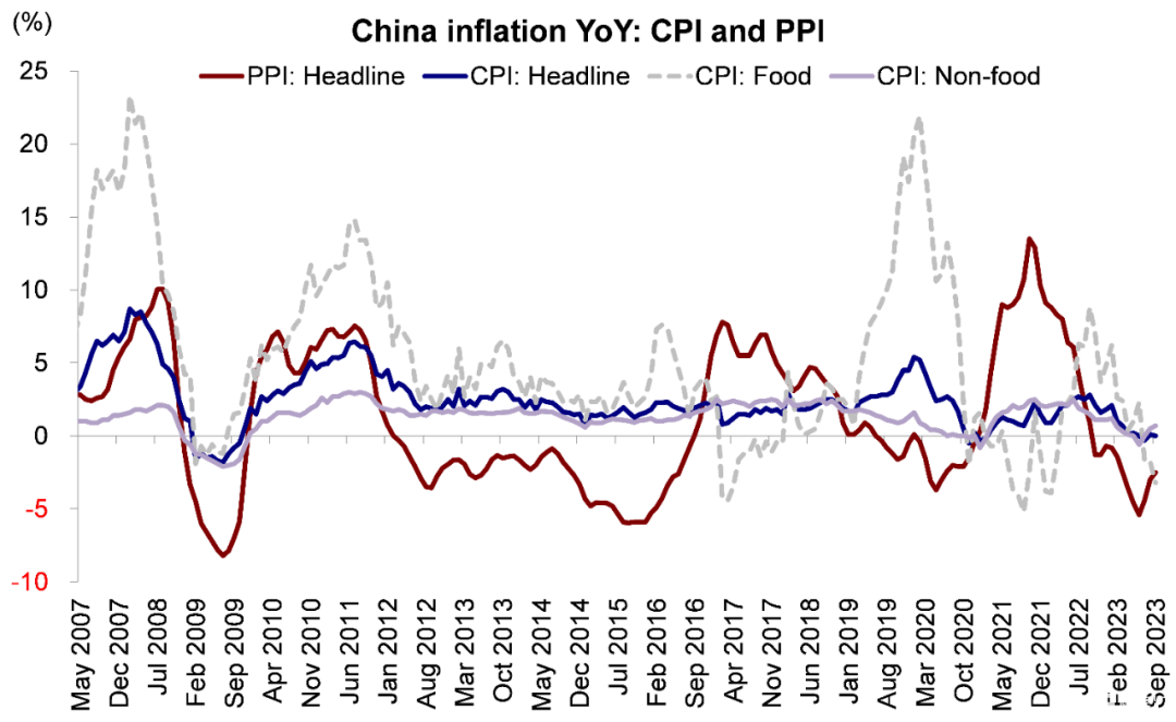 1) 宏观:中国9月PPI同比降幅收窄,CPI同比增速下降。9月受工业品需求逐步恢复、国际原油价格上涨等因素影响,PPI环比涨幅扩大至0.4%,同比降幅从8月的-3.0%收窄至-2.5%,但低于市场预期的-2.4%。CPI环比上涨0.2%,同比持平,略低于前值的0.1%和市场预期的0.2%。国内需求仍待进一步改善[1]。