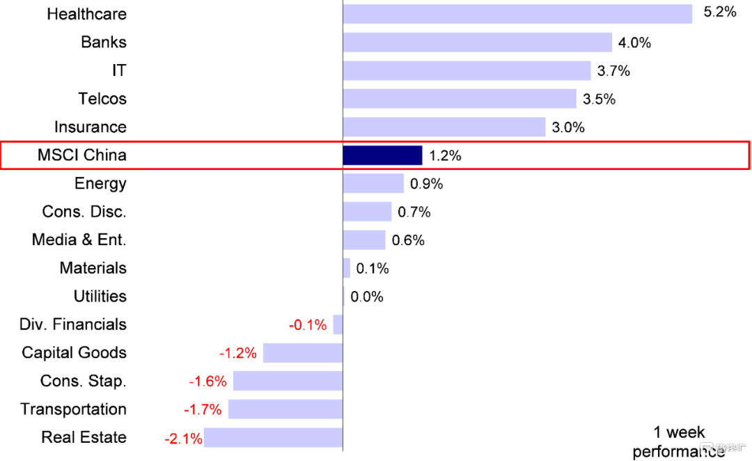 图表:MSCI中国指数上周上涨1.2%,医疗保健和银行板块领涨