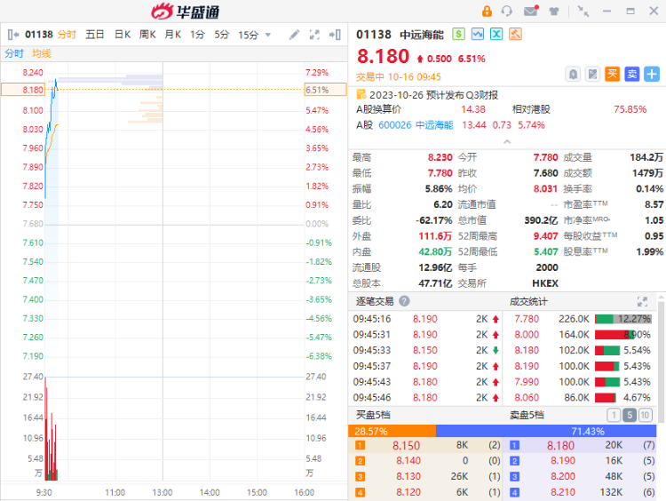中远海能现涨超5%,截至发稿,涨6.51%,报8.18港元,成交额1479万港元。