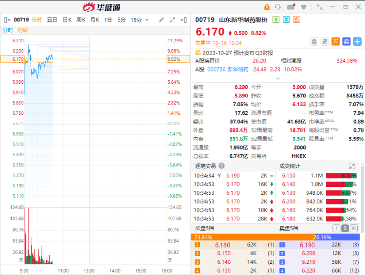 山东新华制药A股涨停,H股涨超10%,截至发稿,港股涨8.82%,报6.17港元,成交额8458万港元。