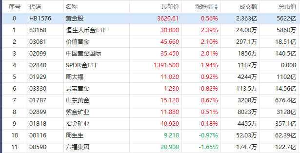 10月16日,港股黄金股普遍上涨,截至发稿,中国黄金国际涨超2%;山东黄金涨0.67%,招金矿业涨0.18%%;紫金矿业涨0.51%。中邮证券指出,地缘冲突叠加欧美高利率给经济带来上行压力,金价有望继续上行。