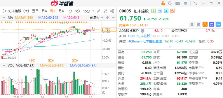 正股表现:汇控( $00005.HK )上周五跌约1.1%,今早继续回吐。早上低开约0.6%后跌幅逐渐扩大,现报61.75元,跌约1.20%。汇控公布,上周五于香港市场回购315.88万股,涉资约1.97亿元。