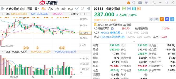 港交所( $00388.HK )上周五跌约1.9%,终止6连升,今早继续下跌。早上低开约0.4%后跌幅扩大,曾跌穿290元水平。现报287.2元,跌约1.78%。有专业机构就利率持续高企和经济增长放缓,料香港IPO市场表现在短期内仍面临挑战,但亦料香港或可在今年底重返全球IPO五甲。