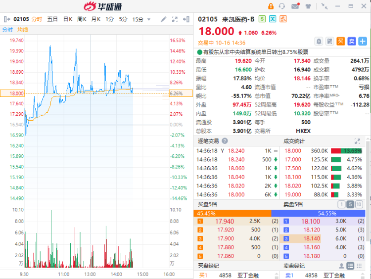 来凯医药-B盘中再涨近16%,高见19.62港元,刷新上市新高。截至发稿,涨6.26%,报18港元,成交额4792万港元。