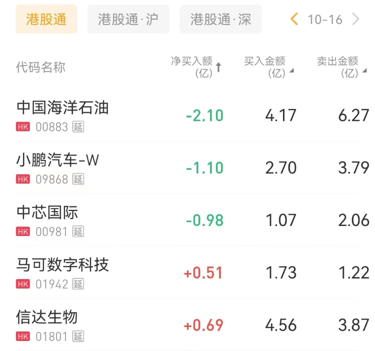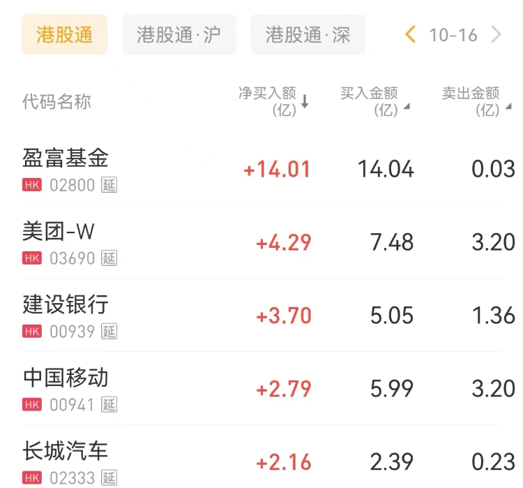 盈富基金、美团-W、建设银行、中国移动分别获净买入14.01亿港元、4.29亿港元、3.70亿港元、2.79亿港元;中国海洋石油净卖出额居首,金额为2.1亿港元,沽出小鹏汽车-W1.1亿港元。
