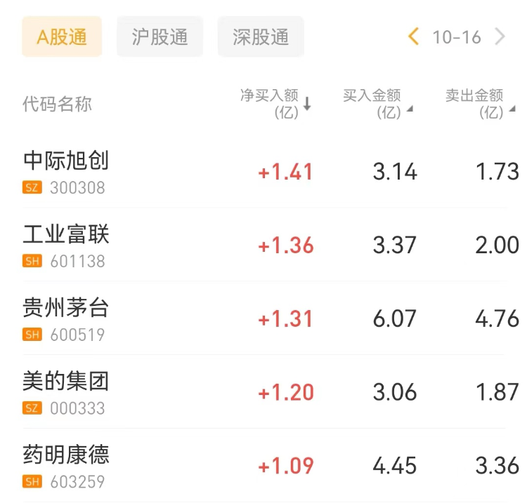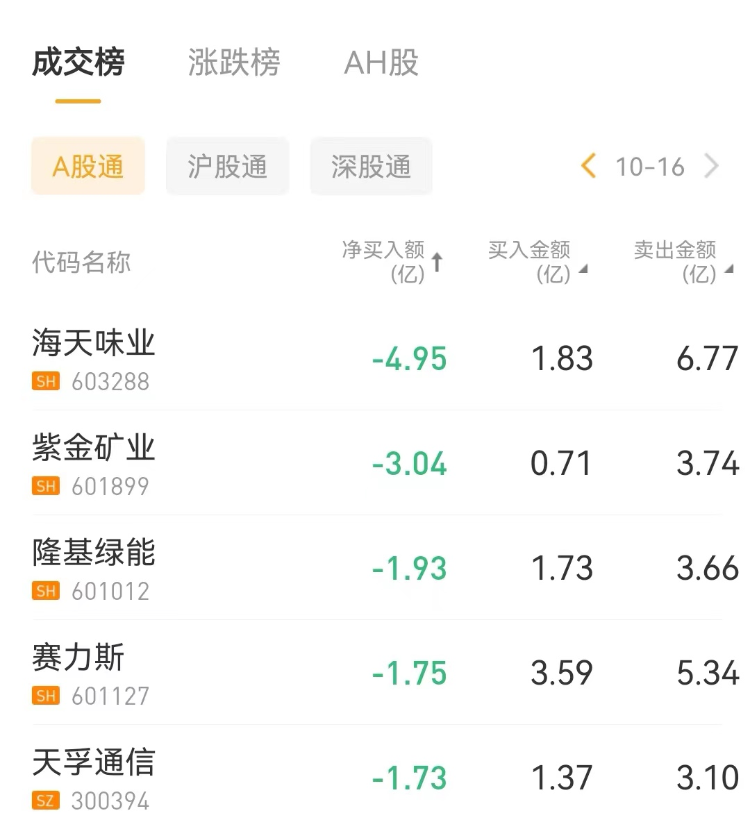 北向资金今日大幅净卖出64.77亿元。海天味业、紫金矿业、隆基绿能分别获净卖出4.95亿元、3.04亿元、1.93亿元。中际旭创净买入额居首,金额为1.41亿元。