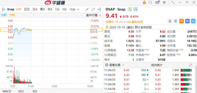 华盛资讯10月16日消息,社交媒体拍照软件Snap股价走高,截至发稿,该股涨超8%,报9.41美元。此前Snap制定了2024年的目标,其中包括广告收入增长20%。该公司表示希望明年年底每日活跃用户超过4.75亿。截至最近一个季度末,Snap拥有3.97亿日活跃用户。