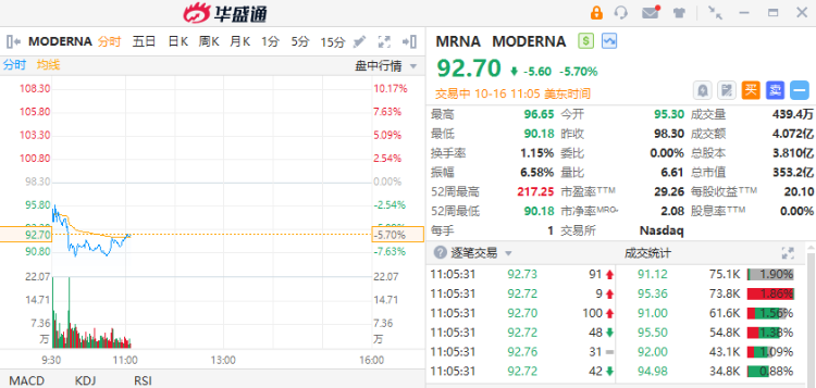 Moderna $MRNA 跌近6%,报92.7美元。根据美国证券交易委员会(SEC)10月13日披露的文件,Moderna董事AFEYAN NOUBAR于10月11日以每股平均价103.2961美元售出1.5万股普通股股份,价值约为154.94万美元。