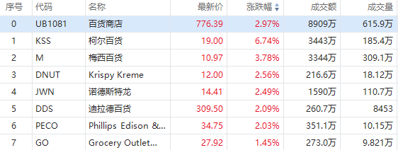 美股百货商店板块集体走强,截至发稿,柯尔百货涨近7%,梅西百货涨近4%,DNUT、诺德斯特龙等涨超2%。
