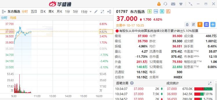 10月17日消息,东方甄选早盘涨超4%,截至发稿,涨4.82%,股价报37港元每股,成交额1.8亿港元。