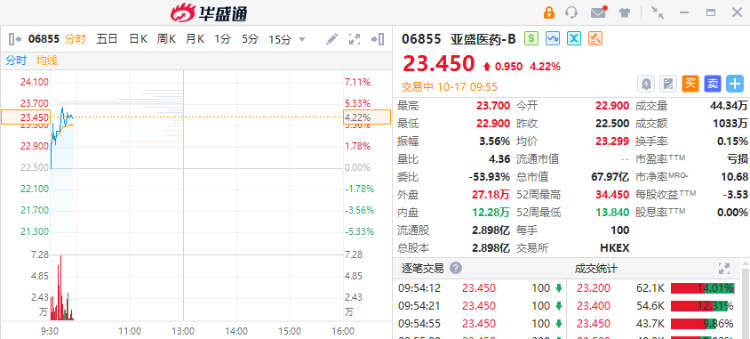亚盛医药-B盘中一度涨超5%,截至发稿,涨4%,报23.45港元,成交额1033万港元。