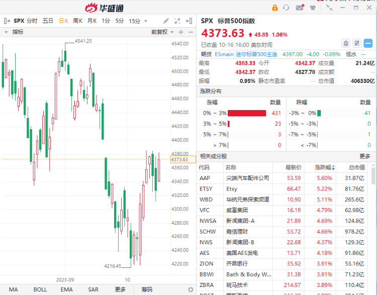 美股周一大幅收高,因投资者对财报季开锣持乐观态度。标普500指数上涨45.85点,或1.06%,报4373.63点。该基准指数今年已经上涨逾14%,这主要是受人工智能热潮推动,以及市场预期美联储加息周期接近尾声的影响。