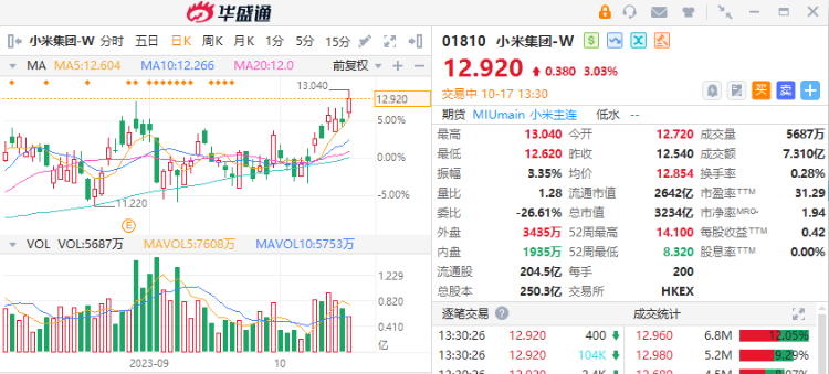 10月17日,雷军宣布小米将启用全新操作系统“小米澎湃OS”。 在消息公布后,小米股价大幅拉升,截止午午间收盘,涨3.19%报12.94港元,总市值3238.61亿港元。