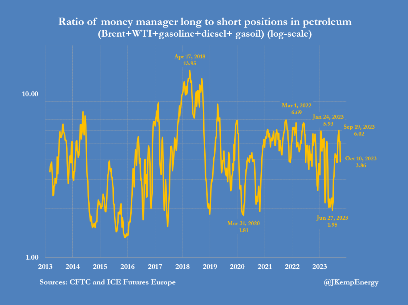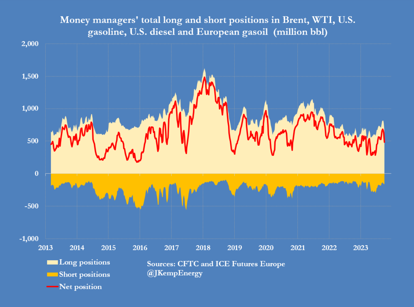 大部分调整来自于对之前多头头寸(1.22亿桶)的平仓,而非建立新的空头头寸(仅1800万桶)。