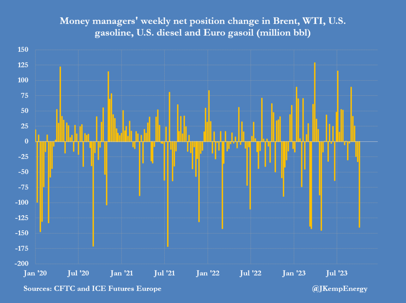 在截至10月10日的七天里,对冲基金和其他基金经理在六种最重要的石油期货和期权合约中卖出了相当于1.4亿桶的原油。