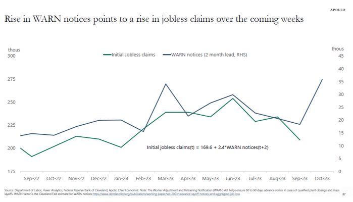 阿波罗全球管理公司 (Apollo Global Management)首席经济学家托斯顿·斯洛克(Torsten Slok)在通过电子邮件发送的评论指出,根据《工人调整和再培训通知法》(WARN)收集的数据,越来越多的公司提前通知员工工厂即将关闭和裁员。