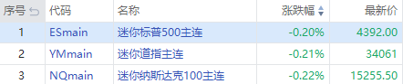 华盛资讯10月17日消息,美股三大期指走低,截至发稿,纳指期货 $NQmain 现跌0.22%,标普500指数期货 $ESmain 跌0.2%,道指期货 $YMmain 跌0.21%。