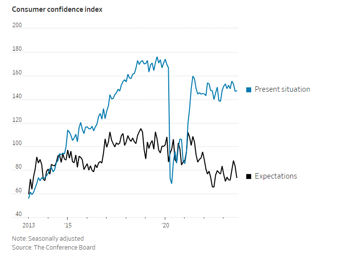 但消费者对经济前景感到相当悲观。9月份消费者信心预期指数跌至80以下,从历史上看,这一水平预示着美国明年将出现衰退。