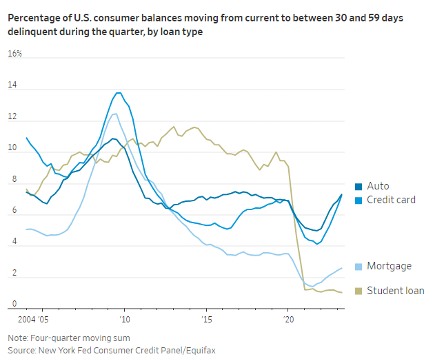 消费者财务压力增加的另一个迹象是,某些类型的消费者债务拖欠率正在上升。