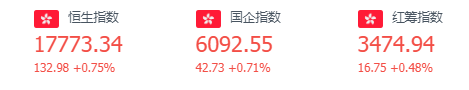 截至周二收盘,恒生指数涨0.75%,报17773.34点,恒生科技指数涨0.64%,国企指数涨0.71%。恒大汽车涨超38%,小米集团-W涨超3%,京东集团-SW涨超2%,国联证券涨超3%。
