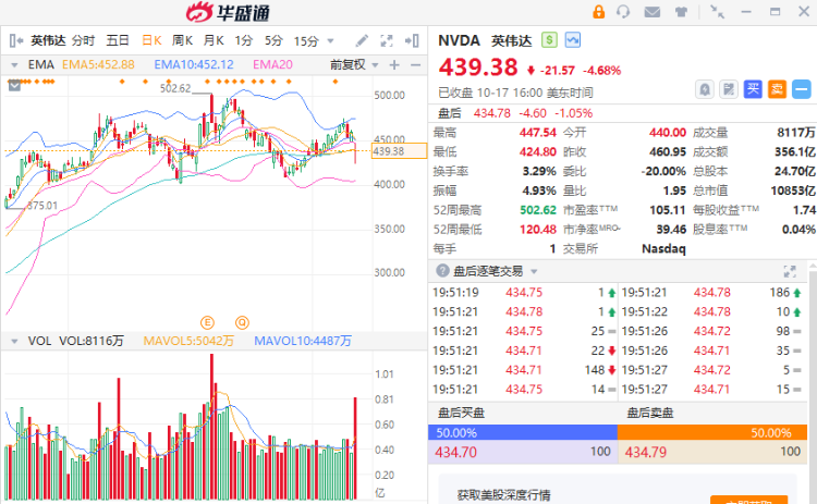 英伟达周二盘中一度下跌逾7%,收盘仍有4.68%跌幅,报439.38美元/股,市值一夜蒸发超535亿美元。