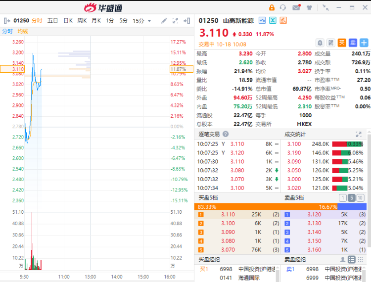 山高新能源涨超10%,截至发稿涨11.87%,报3.11港元,成交额726万港元。
