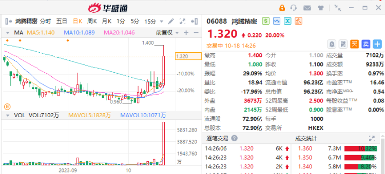 10月18日消息,鸿腾精密逆势大涨20%,截至发稿,股价报1.32港元每股,成交额9233万港元。