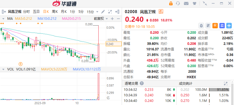 10月18日消息,凤凰卫视早盘一度涨超20%,截止发稿涨18.81%,报0.24港元每股,成交额2249万港元。