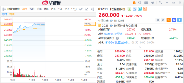 10月18日消息,受益于前三季度业绩预期大幅增加,周三比亚迪股份开盘即小幅走强,截至发稿,股价涨超 7%。