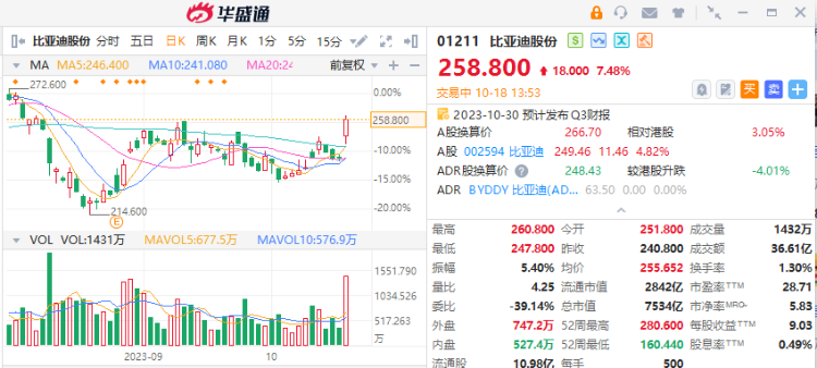 盈喜股比亚迪(01211.HK)为今早大市焦点,集团料第三季盈利最多升约1倍,主要受新能源车销售理想带动。股价升穿50天线,高位曾逼近260元水平,创8月以来最高。
