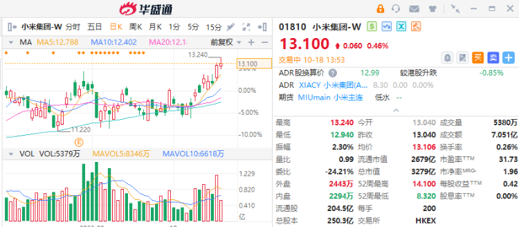 小米年初曾一度升抵14元,如投资者认为後市有望挑战此水平,可参考小米购(18898.HK),行使价16.9港元,实际杠杆6.5倍,2024年04月25日到期。如看淡可注意小米沽(18405.HK),行使价9.99港元,实际杠杆6倍,2024年3月22日到期。