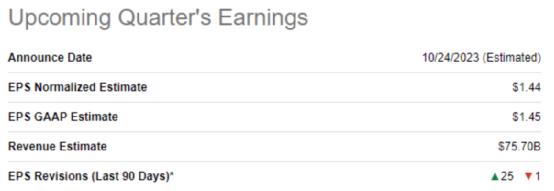 在第二季度预览中,分析师曾预测该公司的收入将略有好转,而每股收益的好坏将取决于公司的运营纪律(又称费用)。事实证明,这是事实,收入小幅增长(2.54%),但每股收益增长略大(7%),因为整体营业利润率同比从 28% 上升至 29%。我预测收入和每股收益将再次小幅上涨,但与上次不同,分析师认为该股的盈利前上涨可能需要不仅仅是小幅上涨才能证明股价进一步上涨是合理的。