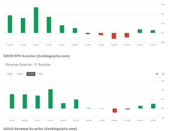 在过去 12 个季度中,谷歌每股收益超出预期 8 次,收入预期超出 9 次。这些数字在第二季度预览期间是相同的。但更重要的是,谷歌在 2022 年连续 4 个季度未达到预期后,现已连续两个季度公布每股收益超出预期。
