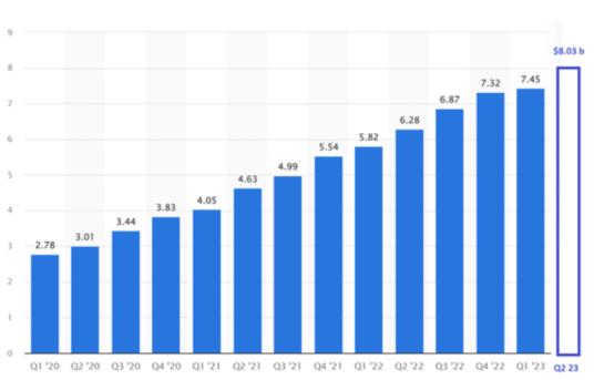 对于第三季度,广告显然仍将是核心赚钱工具,保守预测同比增长类似 3% 至 4%,从而使 2023 年第三季度的广告收入在 561 亿美元至 567 亿美元之间。这仍然占预计总收入 750 亿美元的 75% 以上,这也可能是该公司最终大力推进人工智能业务的原因。