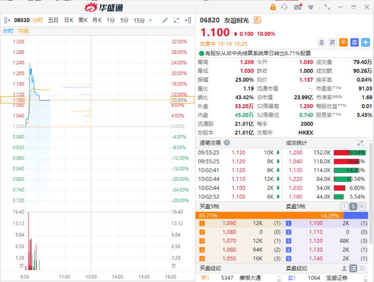 消息面上,根据香港联交所披露文件,10月11日Friends Together Holdings Limited增持友谊时光932.6万股普通股股份,价值约745.61万港元;10月13日,该股东再度增持友谊时光2226.6万股普通股股份,价值约1780.83万港元。