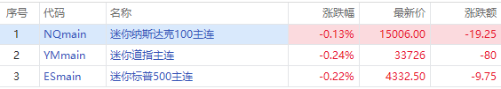 周四美股盘前,三大股指期货小幅下挫,截至发稿,纳指期货 $NQmain 现跌0.13%,标普500指数期货 $ESmain 跌0.22%,道指期货 $YMmain 跌0.24%。