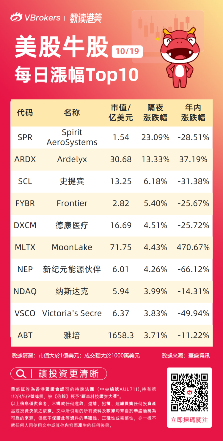 美股科技股普遍下跌,此时可关注一些逆市上升的牛股。發仔梳理了每日美股涨幅Top10榜单,以下为隔夜美股涨幅靠前的个股: