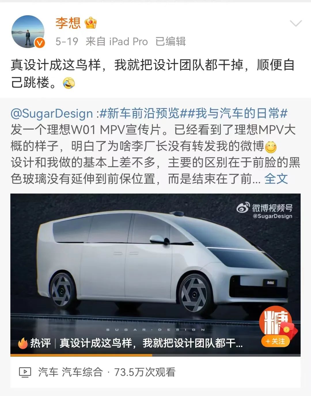 因为就在今年5月19日,有博主用视频自制了一个他认为理想MPV大概会呈现的样子。当时李想转发了该博文并表示:“真设计成这鸟样,我就把设计团队都干掉,顺便自己跳楼。”