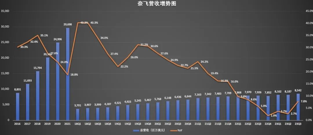 财报显示,今年三季度,奈飞营收为85.42亿美元,与去年同期的79.26亿美元相比,增长7.8%,环比增长4.3%,相比前九个季度环比增幅,有所改善。