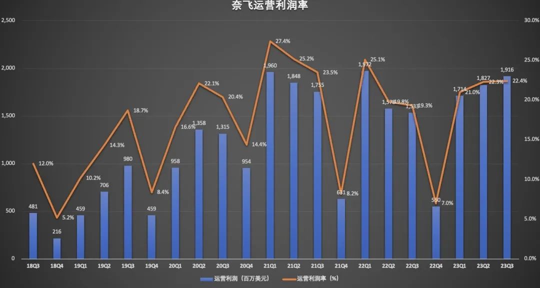 奈飞的盈利能力在持续提升。财报显示,奈飞营业利润19.2亿美元,同比增长25%,超出预期的19亿美元。当季营业利润率为22.4%,较去年同期的19.3%上升3个百分点,也超出市场预期的22.1%。