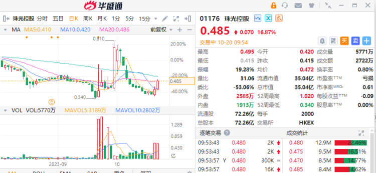 10月20日消息,港股珠光控股现涨近17%,截至发稿,涨16.87%,报0.485港元,成交额2722万港元。