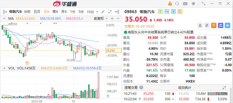 10月20日消息,零跑汽车涨逾4%,截至发稿,股价报35.05港元每股,成交额4.959亿港元。