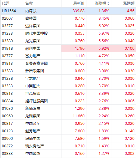 内房股集体走强,截至发稿,碧桂园涨超8%,远洋集团涨超6%,时代中国控股、龙光集团、融创中国涨超5%,富力地产、合景泰富集团涨超4%,雅居乐集团、中国恒大、世茂集团涨超3%,旭辉控股集团、新城发展、龙湖集团涨超2%。