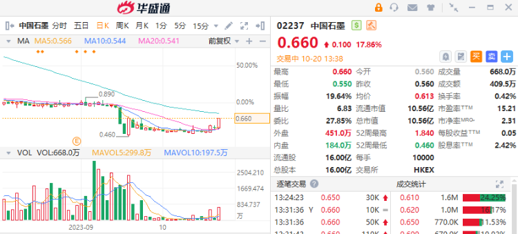 10月20日消息,中国石墨涨超17%,截至发稿,股价报0.66港元,成交额409.5万港元。