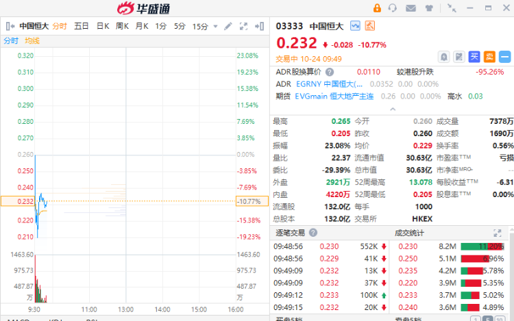 10月25日早盘,中国恒大早盘一度再跌20%,截至发稿跌幅缩窄至10.77%,总市值仅剩30亿港币。