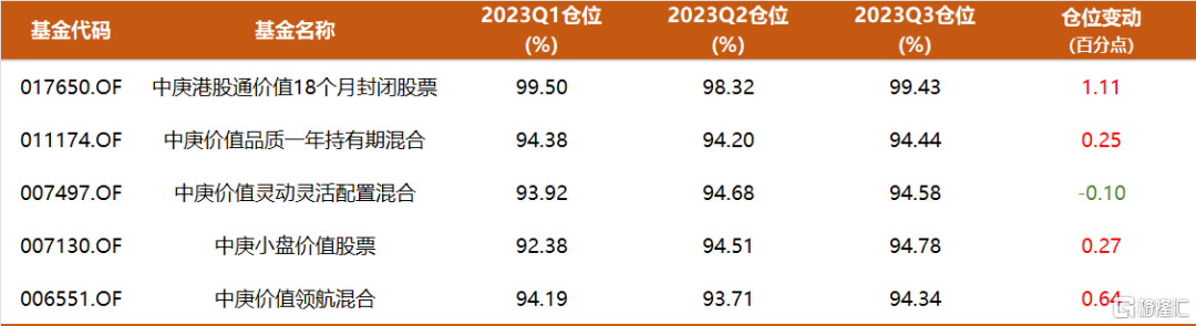 今年二季度,除中庚价值领航外的3只产品进一步将仓位提到了94%以上;