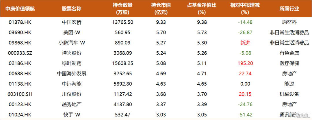 可以看到,中庚港股通价值的前十大中有3只重仓股属于医药行业,